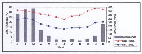 | Das Klima des tropischen Nordosten Queenslands ist vom Monsuneinfluß und dem Auftreten tropischer Zyklone während der Sommermonate zwischen November und Mai geprägt. Daraus ergeben sich für das Untersuchungsgebiet heiße, feuchte Sommer und trockene, milde Winter. Die mittlere Niederschlagsmenge im Gebiet beträgt 2069mm (Station Ingham, JOHNSON, MURRAY, 1997). Etwa 74% des Niederschlages fallen in den Monaten Dezember bis Maerz ( JOHNSON, MURRAY, 1997). Dieser Mittelwert wird im Untersuchungsgebiet allerdings stark beeinflußt vom Auftreten oder aber Ausbleiben tropischer Zyklone in der Region. Die Temperaturwerte sind weniger variabel als die Niederschlagswerte. So erreichen die mittleren monatlichen Maximumtemperaturen 32 C während der Sommermonate und 25 C im Winter während die mittleren Minimumtemperaturen von 23 C im Sommer bis 13 C im Winter reichen. | ||||||